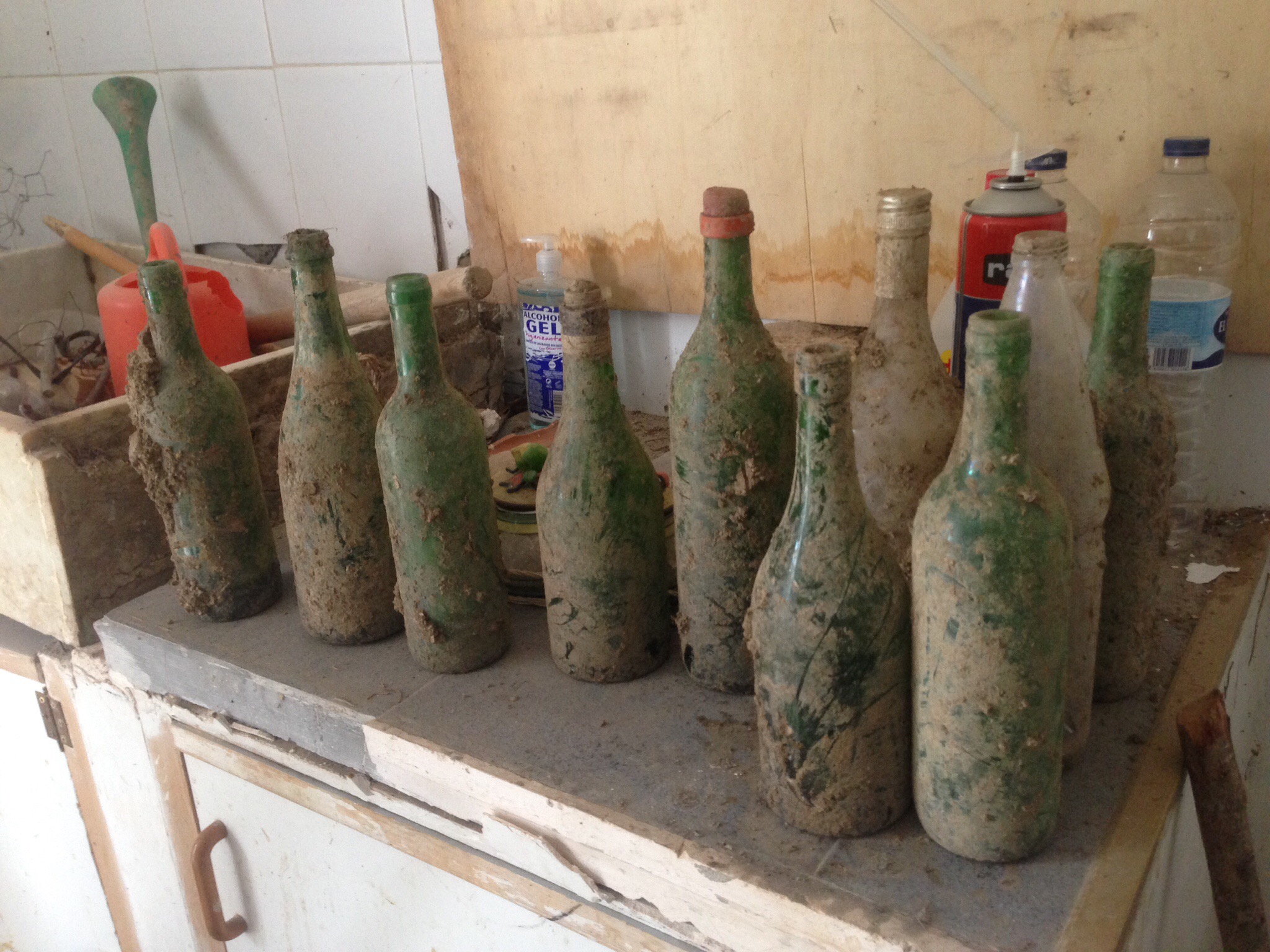 Hace no muchos días, haciendo un agujero en una zona del erre no donde tengo el huerto, di con una botella de cristal enterrada. Los antiguos dueños del terreno que la tirarían allí, pensé inocente de mi. Pero al seguir cavando siguieron apareciendo botellas y botellas, más de 30, ¡más de 30!. Una puede ser que la tiraran allí o se les cayera y se enterrara en el olvido, pero ¡¿30?!