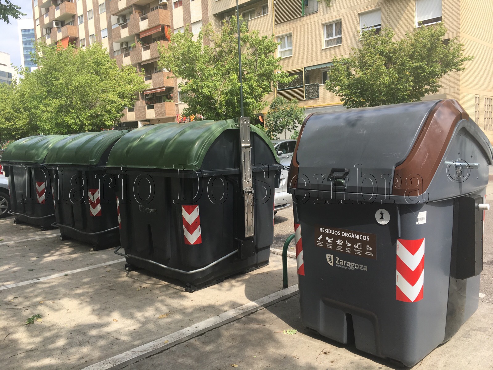 En Zaragoza (Aragón / España), hace tiempo que disponemos de contenedor VERDE para envases de vidrio, contenedor AZUL para el papel, contenedor AMARILLO para envases de plástico, contenedor BLANCO para el aceite usado, y este año han empezado a colocar contenedores MARRONES en uno de los barrios para la recogida de materia orgánica.
