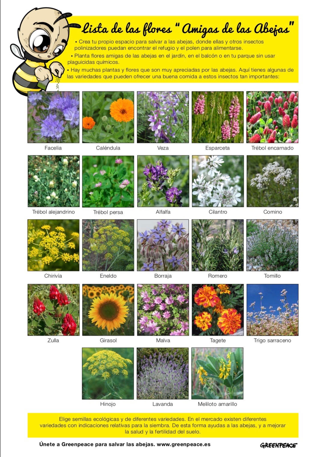 Haciendo una búsqueda por internet, podréis encontrar listados de plantas que ayudan a las abejas. Aquí os dejamos un par de imágenes con una lista de plantas.