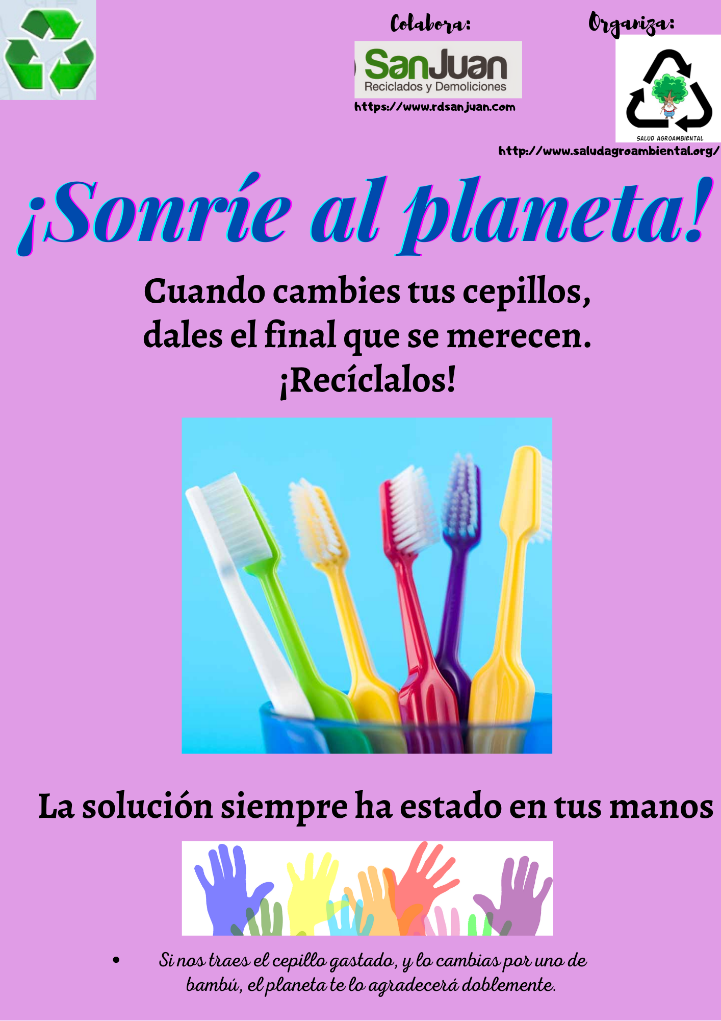 Esta campaña de recogida de cepillos de dientes está organizada por «Salud Agroambiental» colaborando conjuntamente con «Reciclados y Demoliciones San Juan».