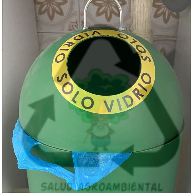 En el armario de debajo del fregadero de la cocina colocamos el mini iglú de Ecovidrio para envases de vidrio. Nosotros prácticamente no generamos residuos de vidrio, por lo que colocarlo aquí es donde menos nos "molesta".