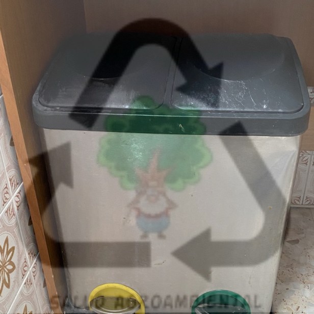 Debajo de la mesa de la cocina tenemos un cubo con dos compartimentos: uno para envases destinados al contenedor amarillo y el otro lo destinamos a los residuos de papel y cartón.(El pedal es verde pero nosotros sabemos que ese compartimento es para el papel 😉 ).