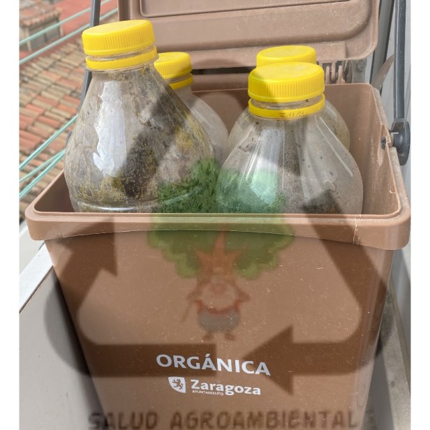 En la ventana de la cocina colocamos el cubo para basura orgánica de Zaragoza, que aunque en nuestra zona no esté instalado todavía el contenedor marrón para este tipo de recogida, nosotros lo aprovechamos para agrupar las cuatro botellas donde separamos los residuos orgánicos y preparamos el compost. Si tenemos demasiadas botellas nos acercamos a uno de los barrios que si que tienen este contenedor instalado.
