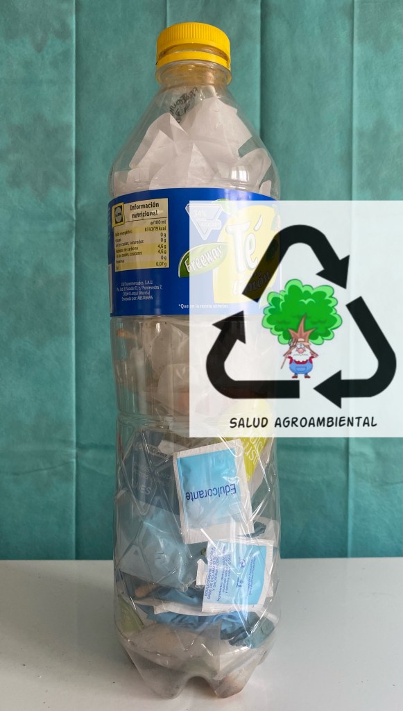 Los pequeños plásticos los vamos depositando dentro de una botella PET. Sería como formar un ecoladrillo, pero aquí en España, al menos en nuestra zona tienen utilidad todavía los ecoladrillos. Pero al menos, llenando la botella de pequeños plásticos, sabemos que esos plásticos no terminarán volados por el viento acabando en alguna zona de naturaleza, o en cualquier alcantarilla, y de ahí a un río y al mar.