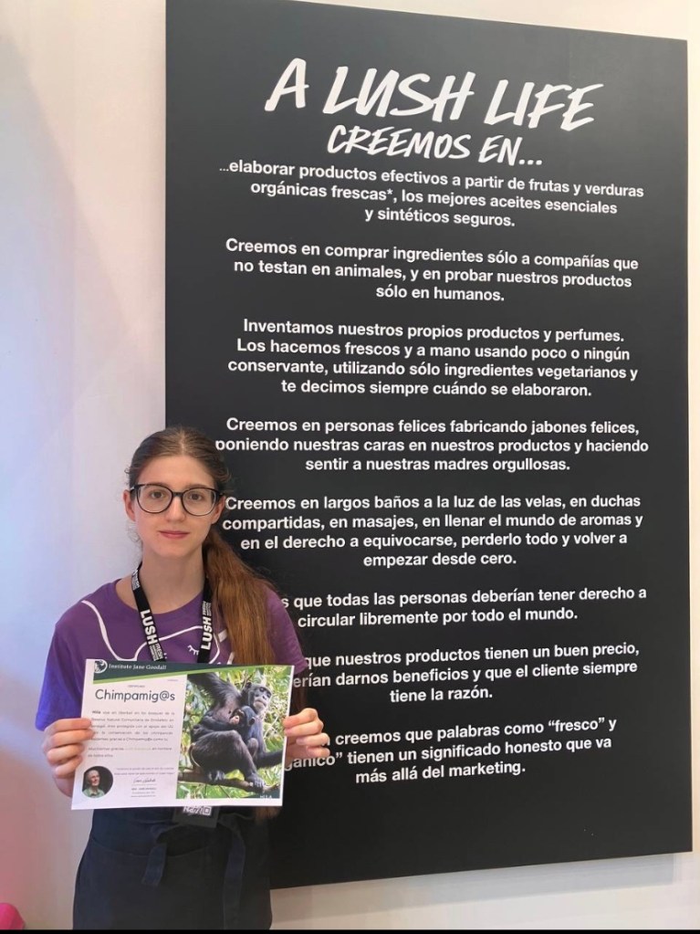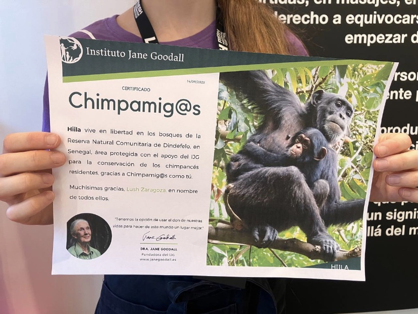 Como agradecimiento con la tienda Lush, le obsequiamos con uno de los apadrinamientos de chimpancés con el instituto Jane Goodall y su campaña “Movilízate por la selva”, que conseguimos este año gracias a la recogida y reciclaje de teléfonos móviles.