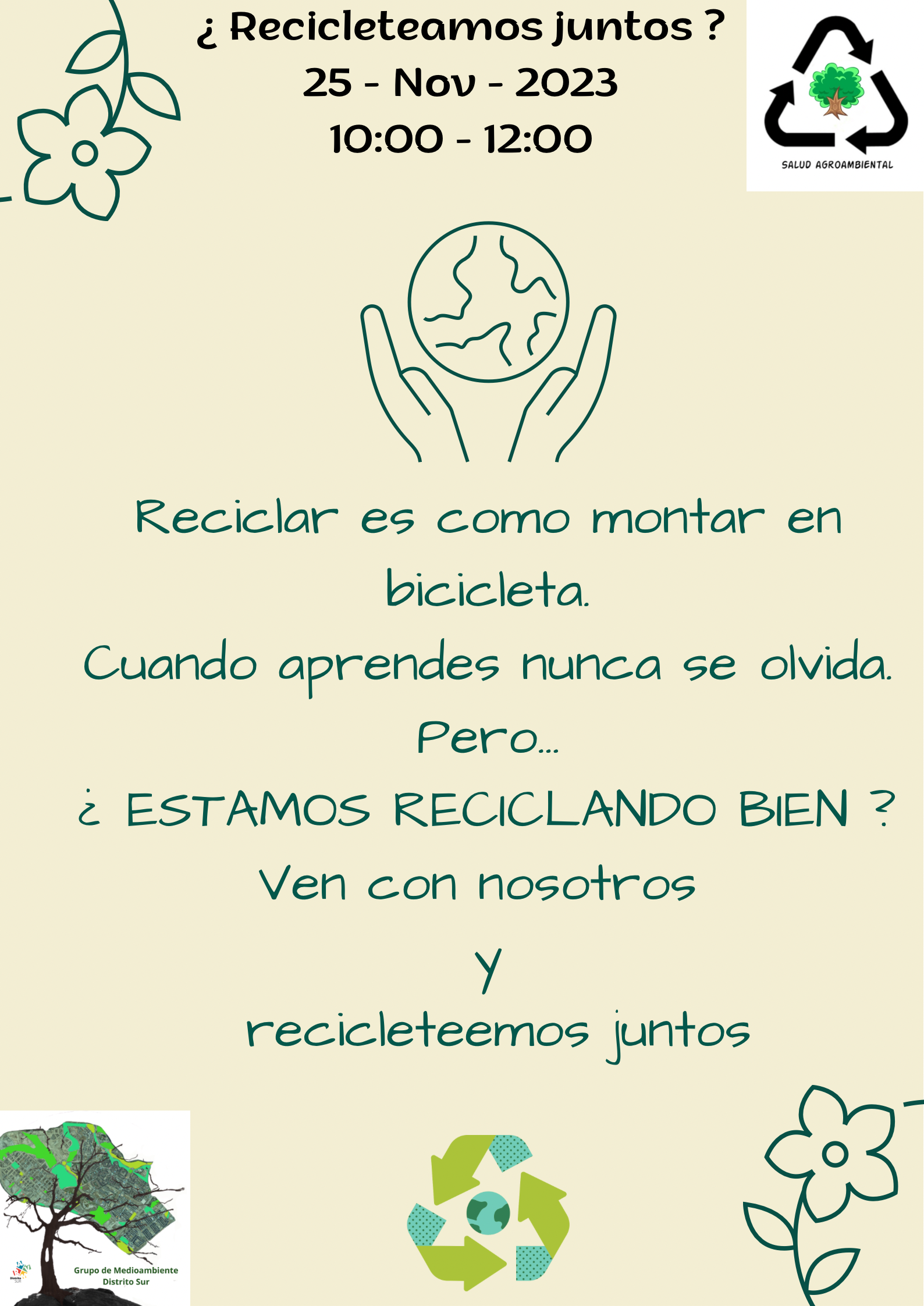 ¡ No paramos ! Esta vez de la mano del Grupo de Medioambiente del Distrito Sur (Zaragoza), en Noviembre estaremos impartiendo un taller/charla del mundo del reciclaje. Reciclar es como montar en bicicleta, una vez se aprende ya no se olvida. El hábito de reciclar cada vez lo tenemos más integrado en nuestra vida y … Continuar leyendo ¿Recicleteamos juntos?
